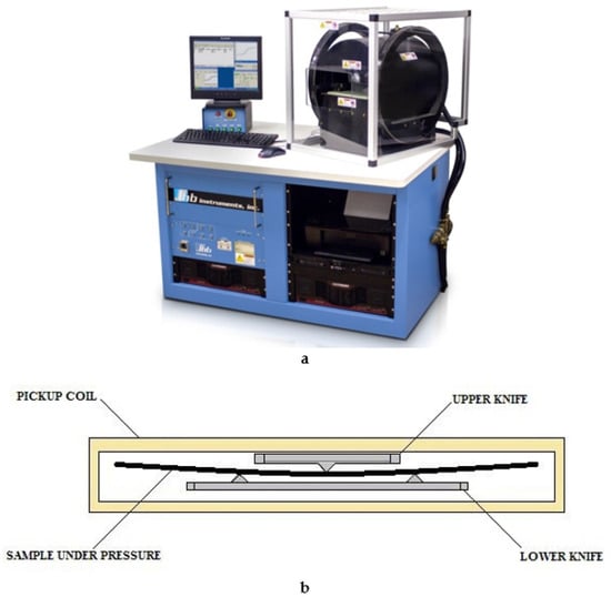 The used control and measuring equipment included a MESA-200 measuring installation from Shb Instruments (USA) with software for control, programming, remote control and diagnostics, as well as a personal computer with installed software [,]. MESA-200 equipment (Figure 1a) allows measuring the magnetic parameters of magnetoresistive structures, as part of silicon wafers up to 200 mm in diameter, in a constant and alternating magnetic field up to 80 kA/m, as well as an inductance field range of 0.01–10,000 nVb/div. The main features are the measurement of the magnetoresistive effect, measurements with a frequency of changes in the magnetic field up to 10 Hz (10 loops per second), digital filtering of background noise to suppress the influence of external fields and suppress the influence of the earth’s magnetic field. To create the required magnetic field, the measuring system includes a 400 mm main axis solenoid and a 450 mm transverse solenoid. The maximum magnetizing field is 80 kA/m along the main axis and 8 kA/m along the transverse axis.