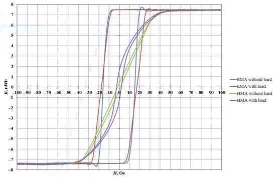 This relationship is demonstrated in Figure 3—B(H) characteristic of the Ta (5 nm)/FeNiCo (30 nm)/CoFe (10 nm)/Ta (5 nm) nanostructure. The figure clearly shows that when a compression load is applied to the sample along the EMA, the coercivity of the nanostructure changes from 1.3 Oe to 2.4 Oe. The change in the loop of the axis of hard magnetization (HMA) and its partial reversal to the EMA can be explained by the appearance of magnetic anisotropy induced by mechanical stress []. During the compression load along the HMA, the coercivity of the nanostructure increased from 15.8 Oe to 17.1 Oe, and the loop did not change.