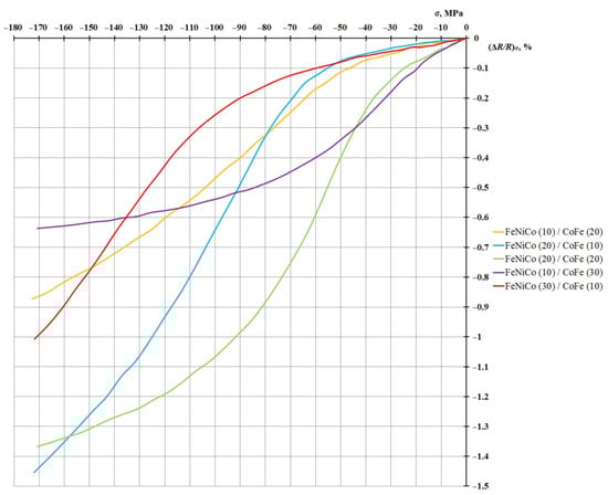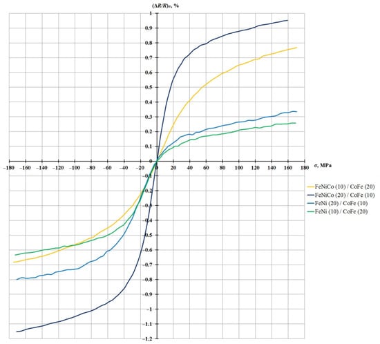 The change in the resistance due to mechanical load (∆R/R)σ depending on the value of the mechanical compression and tension stress ±170 MPa, for five FeNiCo/CoFe-type nanostructures, with EMA at an angle of 45° to the long side of the sample, is shown in Figure 8.