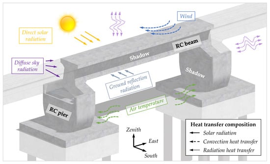For a concrete bridge structure exposed to the environment, the heat transfer acting on the structural surface includes solar radiation, convection heat transfer, radiation transfer, as shown in Figure 1. Therefore, the thermal boundary condition of the structural surface at a certain time is defined as Equation (3):