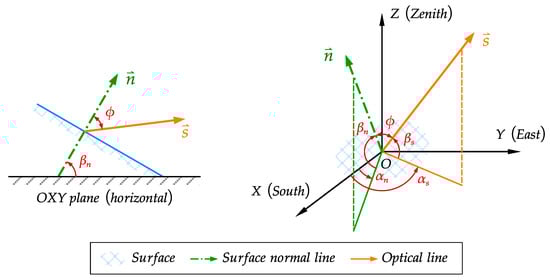 : solar incident angle, which is the angle between the external normal line of the structural surface and the optical line, and ; besides, the structural surface is not exposed to the sun radiation when ; the relation between and other angles can be derived as Equation (4):