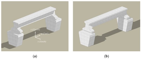 Simulation of solar shadow distribution on the structure on 23 July 2019. (a) 09:00; (b) 15:00.