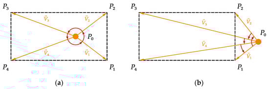 Figure 4. Schematic diagram of the cross-product method. (a) The point is on the plane ; (b) the point is out of the plane . - Step 5: The element of the other surface in shadow induced by the upper structural surface plane can be determined by Step 1 to Step 4.