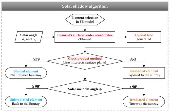 Furthermore, with extracting the external normal vectors of the elements, the real-time solar incident angle was calculated to determine whether the element is toward to sunray. Finally, the whole procedure of the simulation method of the solar shadow is summarized in Figure 5.