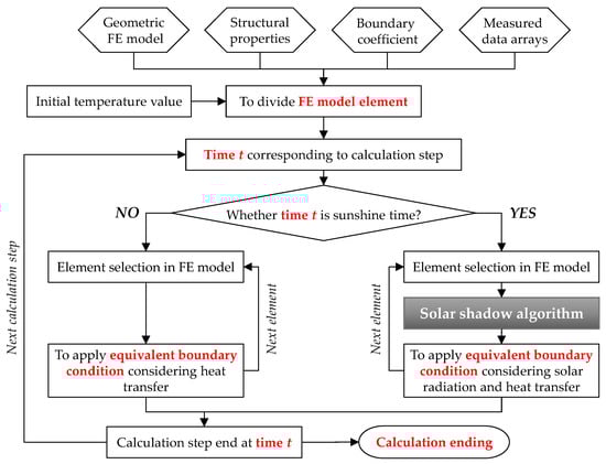 With the rapid development of numerical simulation, the finite element (FE) method can facilitate thermal numerical simulation using heat flow equations [,]. Therefore, the structural temperature fields can be simulated considering different thermal boundary conditions. Several environmental factors, including solar radiation, weather conditions, bridge orientation, material, cross section form, etc., determine the thermal boundary conditions []. Among these factors, solar radiation has a significant effect on the accuracy of numerical simulation []. The temperature field simulation accuracy is usually affected by the real-time simulation of solar shadow and applying a suitable solar radiation flux model. In the literature mentioned above, the simulation algorithm of solar shadow was conducted by the experimental analysis of a simple H-shaped steel specimen [], which was not applicable for the real bridge with complex structural shapes. Therefore, an algorithm for simulation of the solar shadow is first required for numerical analysis of the structural temperature field. In terms of day timescale, a complete simulation method based on continuous meteorological monitoring to predict the nighttime temperature distribution of the structure.