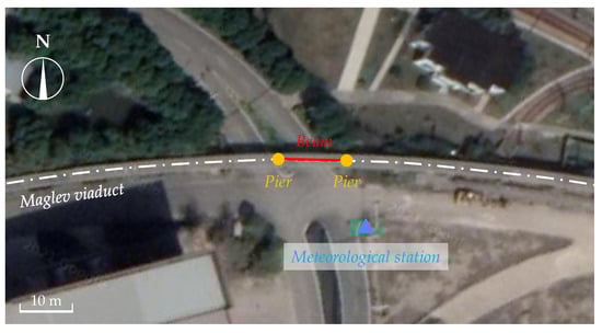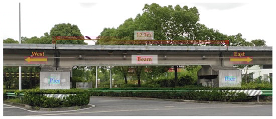 In this study, a concrete maglev bridge, with a simply supported straddle-type monorail track beam and two piers, was tested to obtain the structural surface temperature under regional meteorological effects in summer, as shown in Figure 7. The FE model of the concrete maglev bridge was also created with ANSYS software to simulate the temperature distribution based on meteorological monitoring records. The length of the simply supported beam is 12.3 m. The beam adopted a T-shaped solid section to meet the Maglev track arrangement, as shown in Figure 8.