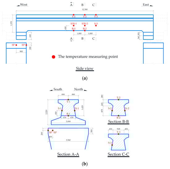 Arrangement of temperature measuring points (unit: mm). (a) Elevation view; (b) key section layout.