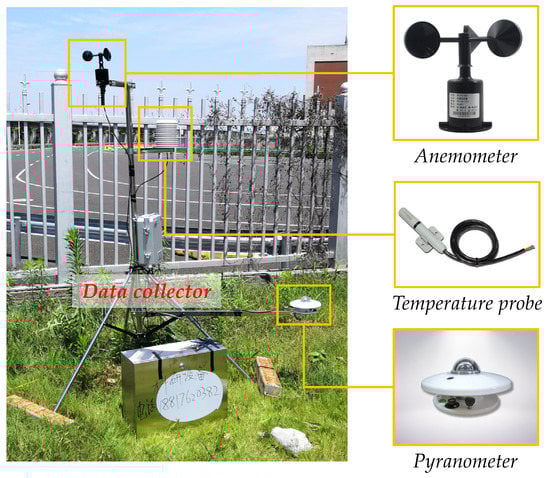 Air temperature, wind speed, and solar radiation are the main factors affecting the temperature distribution of the concrete beam. The meteorological station (BLJW-4), consisting of three sensors provided by Beijing Bolen-Jingwei Company, Beijing, China, was located at an open site ~10 m away from the south side of the experimental bridge to monitor the meteorological conditions, as shown in Figure 9. As shown in Figure 10, the temperature probe (BL-WS) was used to monitor the shade temperature of the air, the three-cup anemometer (BL-FX) was used to monitor the speed of the wind, and the pyranometer (BL-ZFS) was used to monitor the solar radiation intensity. The data collector (BLJW-4) obtained air temperature, wind speed, and solar radiation at a constant sampling rate of 1 time per ten minutes from July 2019 to August 2019, consistent with the structural temperature sampling rate.