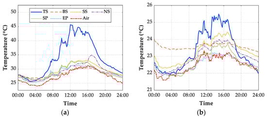Furthermore, the daily minimum values before sunrise during the 27 days were determined, as shown in Figure 13a. The air temperature values were generally lower than structural temperatures, with a difference ranging from 0.5 to 2.8 °C. Therefore, without the measured structural temperature data, the air temperature before sunrise can be adopted as the initial temperature value for transient thermal calculation []. In this study, the average values of the measuring points before sunrise were obtained as the initial value of the temperature field. Therefore, the accuracy of thermal numerical simulation could be improved.