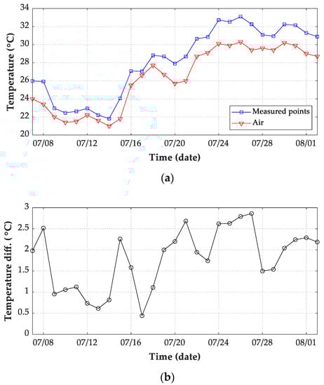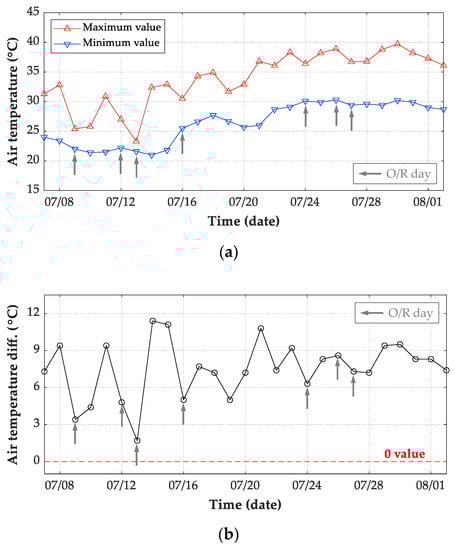 Daily air temperature records from 7 July 2019 to 2 August 2019. (a) Daily maximum and minimum value; (b) daily difference (maximum minus minimum value).