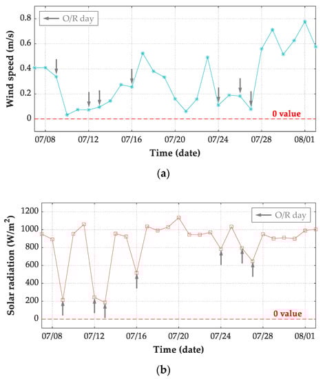 Daily environmental records from 7 July 2019 to 2 August 2019. (a) Average wind speed; (b) maximum solar radiation every 10 minutes.
