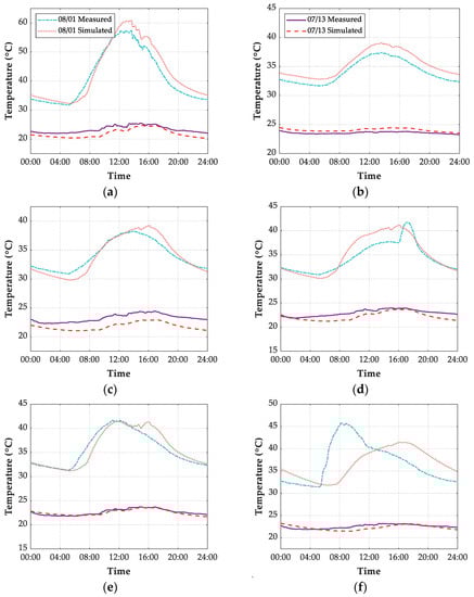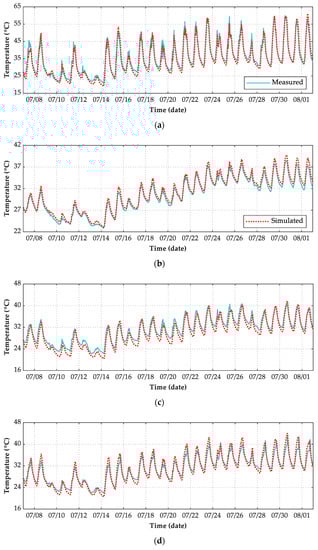 Because of the high solar altitude angles in summer, solar radiation was concentrated on the top structural surface during the mid-day hot hours on a sunny day, leading to the highest simulated and measured temperature on the top, as shown in Figure 19a. The sunray with high altitude angles also caused the most area of the south surface on the beam in the solar shadow. Therefore, the simulated and measured temperature values of the SS point and NS point on the beam surface were relatively close, as shown in Figure 19c,d.