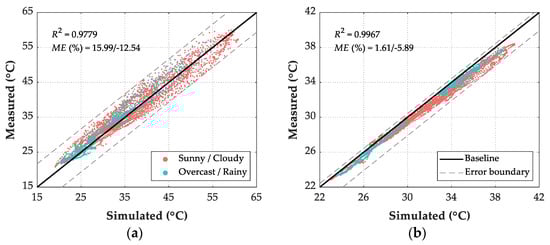 According to observed historical data, the daily weather conditions for the whole experimental period are listed in Table 2. The weather condition can be categorized into sunny, cloudy, overcast, and rainy conditions, based on the cloud amount and rainfall level. There were seven days recorded in obviously overcast or rainy (O/R) conditions. The corresponding numerical simulation results of these seven days will be discussed separately in Section 6.2.