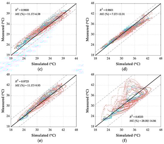 Intuitive plots of simulated results and measured records for six measuring points are shown in Figure 10, in which each dot corresponds to a calculation and measurement step. In these figures, the further away the dot is from the baseline, the larger the error is. Here, the maximum error rate () illustrates the deviation level as Equation (25):