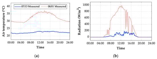 As wind speed is also an influential factor on convection heat transfer flux, the daily average wind speed for the whole record period is presented in Figure 15a. It is obvious that the daily average wind speed ranged from 0 m/s to approximately 0.8 m/s. Meanwhile, during the test period, the recorded maximum wind speed was 2.2 m/s, while a daily minimum wind speed of 0 m/s was frequent. Both the air and structural temperatures are dominated by solar radiation during the appearances of sunrays. The air is warmed by sunrays under sunny conditions during daytime and cooled without sunrays during night hours. Therefore, solar radiation has high intensity during daytime on S/C days and low values on O/R days. The daily maximum solar radiation for the test period is plotted in Figure 15b. The maximum recorded value of the daily maximum hourly global solar radiation was recorded on 20 July 2019 with sunny condition, which was 1135 . Meanwhile, daily maximum solar radiations less than 300 were recorded in heavily overcast or rainy days, such as 09 July 2019, 12 July 2019, and 13 July 2019. Therefore, daily maximum solar radiations intensity on O/R days were generally lower than that on S/C days.