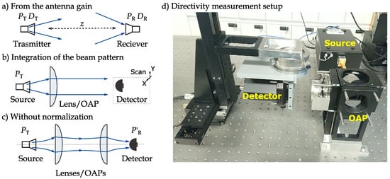 If antenna gain is not determined, the maximal directivity approach for the effective area estimation should be applied ([], p. 92). The gain and directivity are linked to each other as . Thus, the equation does not include the loss of power due to antenna inefficiency; however, it allows estimating power, which is incident on the antenna’s effective area. Furthermore, the antenna’s directivity is much easier to experimentally assess than gain, thus being used reasonably to compare different detectors’ optical characteristics.