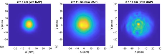 Figure 2a,b shows the spatial THz beam profiles recorded with our resonant FET-based detector by employing an XY motorized scanning stage and taken at 5 cm and 11 cm distances. The resolution step of the scan was 0.5 × 0.5 mm. As expected, the radiated beam had a vertical linear polarization with an approximately Gaussian intensity distribution perpendicular to the propagation direction. According to the measurement, the radiation beam’s diameter w at half-power ( dB) points is 11.5 mm at a 5 cm distance from the source, and 20.0 mm—at 11 cm. The estimated waist using antenna parameters provided by VDI is, accordingly, 10.5 mm and 22.4 mm. The difference between experimental and theoretical values can be explained with the beam wavefront curvature at the shortest distance. Because we scanned beam profiles in the XY plane, it resulted in a wider diameter.