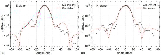 The responsivity was calculated using the measured power density profile at 5 cm distance and Equations (1) and (2) (Method I). We extracted the dB from the EM simulation using the finite element method with adaptive mesh and CST Studio Suite software. The antenna model consisted of the detector planar metal antenna and the 4 mm diameter hyper-hemispherical Si lens coupled from the substrate side. This lens was used in the majority of our beam profile XY scanning experiments. The validity of EM simulation results was checked experimentally—measuring the detector directivity. The directivity was determined by recording the rectified voltage as a function of the device’s tilt angles in the E- and H-plane. The measured radiation patterns are shown in Figure 3. The modeled patterns are shown as a dashed line in the same figure. The measured and modeled main lobe FWHM angles are in good agreement: accordingly, 19.5° vs. 17.9° in the E-plane, and 21.0° vs. 20.2° in the H-plane.