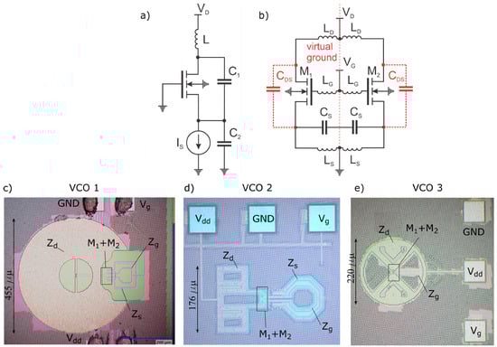 (a) The schematic of the basic concept of Colpitts oscillator. (b) The proposed VCO is based on the differential configuration of the Colpitts oscillator. Die micrographs of the first VCO ((c), area of core 465 µm × 455 µm), the second VCO ((d), 284 µm × 176 µm) and the third VCO ((e), 305 µm × 220 µm).