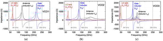 Simulated impedances of VCO core’s elements (inductors, the capacitor, and the antenna) for three proposed device implementations: (a)—for VCO1, (b)—for VCO2, and (c)—for VCO3. The solid lines—a real part, the dashed lines—an imaginary part of the impedance. The vertical gray lines correspond to fundamental (84 GHz), second (168 GHz), and third (250 GHz) oscillation harmonics.