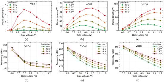 The predicted frequency at the 3rd harmonics as a function of gate voltage is presented in Figure 6d–f. The simulations show that the emission frequency can be tuned by changing the gate and drain voltages in the range between 250 GHz and 253.5 GHz (corresponds to 1.4% tuning range) for VCO1, and from 243 GHz to 253 GHz (4% tuning range) for VCO2 and the widest 5.2% tuning range (from 248 GHz to 261 GHz) for VCO3.