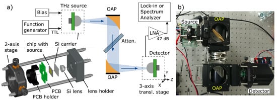 The experimental characterizations and the validation of simulated circuits have been performed in the experimental setup as shown in Figure 7a. The source module was packaged using Thorlabs 30 mm cage system components and own-manufactured adapters. The VCO circuit chip was glued to 500 µm Si wafer (a carrier) as an intermediate medium for the hyper-hemispherical Si lens with a 12 mm diameter and a 6.8 mm height. This wafer is also glued to a printed circuit board (PCB). The PCB holder was used to connect the chip with the Si carrier to the X-Y translation stage. The last one lets us change the VCO position regarding fixed Si lens, and as a result of this to tune THz emission direction. We used the hyper-hemispherical Si lens to reduce a THz beam’s divergence and minimize losses due to internal reflections on silicon-air boundaries []. The free-space propagating Gaussian beam is collimated and then focused with two off-axis parabolic mirrors (OAP). The selection of focal length and diameter depends on the transmission distance. We used mirrors with a 4 inch reflected focal length and a 2-inch diameter for all characterization experiments and the imaging application where the distance exceeds 1 m. The 18 dB attenuator is designated to suppress the feedback to VCO, which originates from the reflections from the THz detector.