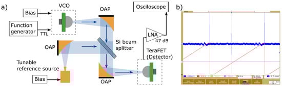 For the measurement of VCO frequency, we employed the heterodyne detection scheme (see Figure 8a). As a second reference source, we used an all-electronic THz multiplier fabricated by RPG Radiometer Physics GmbH. A 500 µm-thick Si beamsplitter and three off-axis parabolic mirrors with 4-inch effective focal length were used to combine, collimate and focus two THz beams onto our resonant FET-based detector. The reference source was swept in a frequency range from 240 up to 270 GHz. The response of TeraFET was recorded with an oscilloscope; then, the beat frequency was extracted manually from an oscillogram. The typical measurement result is showed in Figure 8b.