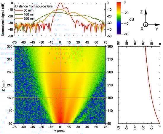 Beam profile of VCO1 in the Y and Z direction, measured with a resonant detector (the setup similar to depicted in Figure 1b, but does not contain the mirror/lens). The data is normalized to the maximum signal. Top: horizontal cross-sections at different distances from the source lens. Right: vertical cross-section at the middle of the THz beam.