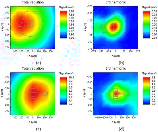 The difference in radiation center locations of separate harmonic signals on the VCO1 crystal has one positive side effect. It is easier to separate the third harmonic from the fundamental one employing simple Si lens positioning techniques such as a justification procedure with a compact 2-axis translation stage or placing and gluing the optical element using a commercially available pick-and-place station. For comparison, we also present the XY scans of the VCO2 chip (see Figure 10c,d). Despite the more efficient suppression of the amplitude of the fundamental oscillation in this design, both harmonics are radiated from the same place—the center of the drain’s antenna. Therefore, more sophisticated filtering techniques should be involved when the practical application would require spectral purity. For example, the resonant TeraFET detectors as employed by us can be efficiently utilized as a high-pass filter for separation of 3rd harmonic. However, we would like to address the current challenge that evaluating the radiated power with commercially available calibrated broadband detectors is more complicated.