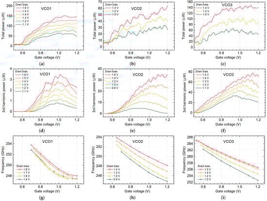 The proposed VCOs’ measured total power (a–c), 3rd harmonic power (d–f), and frequency (g–i) dependency on the gate and drain biases.