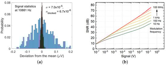 At high SNR levels, the rectified signal also introduces a substantial increase in detector noise. It is demonstrated in Figure 12a when the signal of 0.6 V at detector output at 10,881 Hz modulation frequency results in about a ten times increase of standard variation compared with blocked conditions. The dependence of expected SNR as a function of the detected signal for different modulation frequencies is shown in Figure 12b. It clearly demonstrates the appearance of an excess 1/f type noise, which corner frequency increases with the increase of the incident power or committed detected signal. Above the corner frequency, the SNR and the precision of amplitude determination become equal.