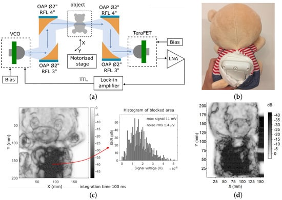 The two-dimensional raster-scan images of the teddy bear are shown in Figure 13c. The images comprise 4 k pixels covering different focal plane areas in the range of 90 mm for head and 150 mm for length, a thinner part as the hand has 30 mm thickens. It was composed of non-woven fabric and is covered by soft velour. The toy has a sensor at extremities and a voice module inside the body that is shown in Figure 13b. We used Ø12 mm hyper-hemispherical lens in the source module. This lens is well coupled to a Gaussian-beam system, and couples to a converging beam []. At the same time, the hyper-hemispherical lens could effectively increase the gain of the TeraFET integrated antenna by as theoretical maximum, where n is the refraction index of the lens [].