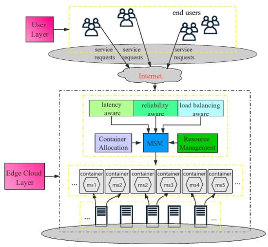 Edge computing offers an extension to the central cloud, bringing cloud capabilities close to the end users for edge application providers to deploy their services. In comparison with cloud computing, the advantages include lower data transmission latency, better bandwidth utilization, and improved privacy of user data in the Edge-Cloud collaboration. Previous research [,] has shown that the higher the proximity of the application or service to the user, the better the Quality of Service (QoS) attainable by the user. A major limitation in edge computing vis-à-vis traditional clouds is the limitation in resources. However, the traditional cloud model suffers diminished network performance and inefficiency occasioned by the processing and analysis of big data generated from remote edge devices. This design results in increased pressure on the network created by the traffic pattern leading to poor user QoS. Similarly, in the traditional cloud, services are usually implemented with the same level of availability with less regard for service/application-specific characteristics. In contrast, different Internet of Things (IoT)/Edge applications have various characteristics and performance requirements [,,]. Examples of these edge applications include data analytics, augmented/virtual reality (AR/VR), autonomous driving, smart manufacturing, etc.