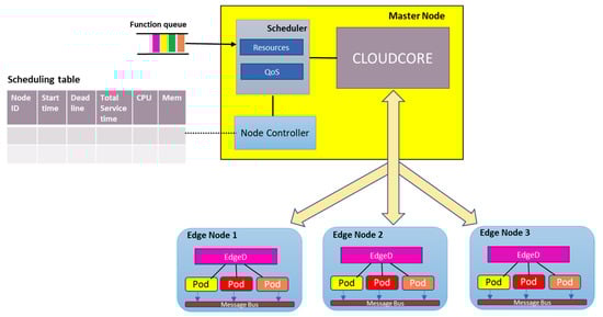 Exploiting containerized technology to host applications can provide a way to improve the performance of edge computing platforms []. Containers are a lightweight application virtualization technology that provides a logical packing mechanism for application abstraction that packages software and dependencies together. In addition to providing a virtual runtime environment based on a single operating system (OS) kernel, containers also support resource sharing across multiple users and tasks concurrently rather than booting an entire OS for each application []. This permits agile application deployment, orchestration environment consistency, OS portability, application-centric management, and resource isolation for container-based applications. A high-level view of a containerization framework with a custom scheduler [] is displayed in Figure 1, which is similar to our proposal from a deployment perspective. Multiple leading cloud computing providers have also adopted containers for the deployment of services directly on their edge platforms: Google Cloud IoT, Microsoft Azure IoT Edge, and Amazon AWS IoT Greengrass [,]. Therefore, in this work, we enhance our work in [] by implementing a real test bed through adopting the KubeEdge orchestration platform that is based on Kubernetes. The summary of our contributions are as follows: