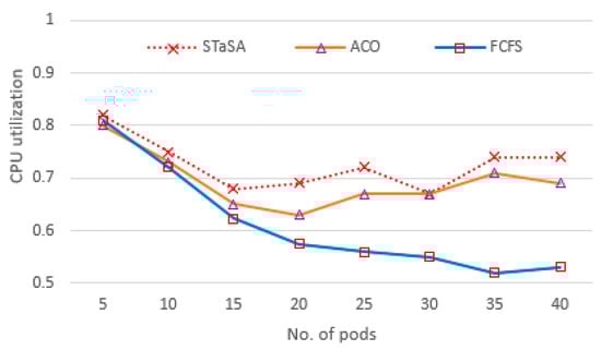 In our implementation environment, we investigate the three aspects of utilization, service time, and cost. Consequently, three algorithms have been compared, and the results are shown in Figure 4, Figure 5, Figure 6, Figure 7 and Figure 8. CPU utilization is investigated in Figure 6, where it is shown that STaSA outperforms the other two algorithms. As can be seen by the increase in the number of pod instances, the utilization value is slightly above average for all the algorithms but improves in STaSA as the ants are able to find the nearest optimal solution mapping for the pods to nodes. This indicates the minimum fitness value has been reached. ACO also shows good performance, but FCFS with imbalanced processing performs badly when computing slower tasks. Additionally, considering that all the workers operate in parallel, STaSA can keep the CPUs busy due to a fast upload resulting in higher resource utilization.