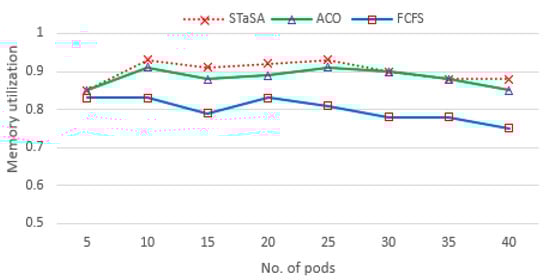 Memory utilizations among different nodes in a cluster system are highly unbalanced in practice where page faults, i.e., memory misses, might occur in some heavily loaded nodes. This is demonstrated well in Figure 5. When the number of requests is low, the utilization rate for all the algorithms is relatively lower. However, with increasing pod requests, STaSA is able to attain a higher utilization and slightly outperforms ACO. Their solutions converge at a point when the pods are between 30 and 35, but STaSA is able to minimize page faults and produces better results.