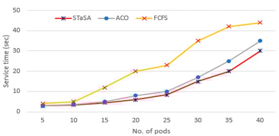 As can be seen from Figure 6, when the number of pods is low, the pod service of the three algorithms is relatively minimal. With the increase in the number of pod instances, the service time of STaSA and ACO is significantly better than FCFS. This is due to STaSA and ACO being able to converge faster and offer a better performance solution for the combinatorial optimization problem. Simultaneously, we observe that the service time of STaSA is slightly better than baseline ACO.