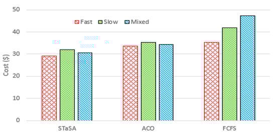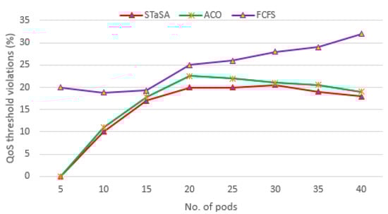 Figure 7 shows the total costs of the workload for the three algorithms. We can see that when the difference in cost between STaSA and ACO is relatively small compared to FCFS. This observation can be explained from the perspective of the relationship between cost and utilization factors. Additionally, our approach adjusts the corresponding pheromone value that is considered in the objective function. This results in a better solution with the cost as a constraint. The service time of the three algorithms is used as a basis to observe the QoS performance. We monitor the algorithms under the same QoS requirement to determine their efficiency. A function instance is considered unavailable or busy while processing a request, and if there are no other available instances of that function, then the scheduler is unable to schedule and run another request for the same function until an instance becomes available. Those are considered unscheduled pods. We can observe in Figure 8 that STaSA outperforms the other two algorithms throughout. It demonstrates very low violations, which means that it has a higher success rate compared to the other two.