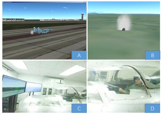 Fighter visual simulation (A), target visual simulation (B), the displays (C), fighter cockpit (D).