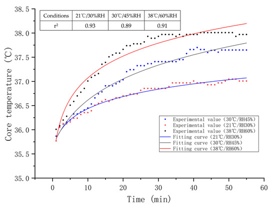 The core temperatures and logarithmic fitting curves versus time under three conditions, and high values of r2 indicate goodness of fit.