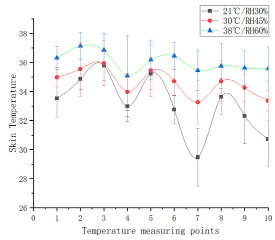 The skin temperature of the hands was 35.45 °C under 38 °C/60% RH condition, which was 5.99 °C higher than that under 21 °C/30% RH. Compared with the increase in skin temperature in the other points, the change of hand was the biggest (p < 0.001), and the interaction of thermal conditions and time on the mean skin temperature of the hands (p < 0.01). According to the increased value of each position, the skin temperatures can be classified into three groups: the skin temperature variations of the chest and abdomen increased less than 1 °C, while the skin temperature range of the hands, feet, and forearms was more than 3 °C, and the temperature range of other positions was 1–3 °C. Under a high-temperature environment, there was no difference between the mean skin temperature of each part (p > 0.05).