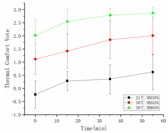 As shown in Figure 6, there was a difference in thermal comfort vote among three conditions, which increased with rising ambient temperature and humidity (p < 0.001). In a 21 °C/30% RH environment, there was no difference in thermal comfort (p = 0.077); the subjects were in a relative comfort state, whose votes ranged between 0–0.5, and no interaction effect of heat condition and the task was found (p = 0.052). The thermal discomfort increased over time under 30 °C/45% RH (p = 0.01) and 38 °C/60% (p < 0.001) RH. At 38 °C/60% RH, in particular, the votes ranged between 2–3 with the standard deviation decreased with time, reflecting the extreme discomfort of the subjects.
