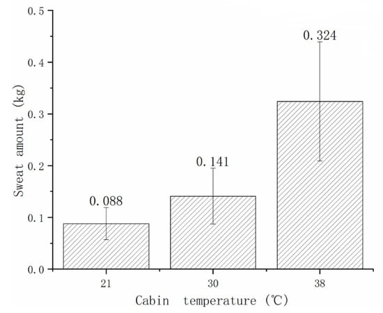 Figure 7 shows that the mean sweat amounts increased significantly with rising ambient temperature under the three experimental conditions. The sweat amounts of subjects at 38 °C/60% RH were higher than those of 21 °C/30% RH and 30 °C/45% RH (p < 0.01). However, no difference was observed between conditions at 21 °C/30% and 30 °C/45% RH (p= 0.05), as it is known that the body begins to sweat at low wind speeds when the male skin temperature reached 34 °C [,,]. As shown in Figure 6, the sweating was considerably smaller at 21 °C/30% RH, which just reached the critical point, with a mean of 0.088 kg. At 38 °C/60% RH, the sweat amount increased remarkably to 0.324 kg on average. This was equivalent to 0.5% of the mean body weight, which was 3.7 times that at 21 °C/30% RH.