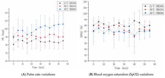 As shown in Figure 8A, there was an interaction effect of heat condition and task on pulse rate (p = 0.001), and the pulse rates show inter-condition differences among different tasks (p < 0.001). In the 38 °C/60% RH environment, the pulse rate linearly increased over time (p < 0.01, r2 = 0.78), with a maximum of up to 106 bpm. Under the other two conditions, the temporal changes in pulse rate were not significant. According to the analysis of changes in SpO2 in Figure 8B, there was no interaction effect of heat condition and the task (p = 0.746), and no differences were reported between the conditions of 30 °C/45% and 38 °C/60% RH (p = 0.146). The level of SpO2 under 21 °C/30% RH was significantly higher than that under the other two conditions (p1 = 0.001, p2 < 0.001).