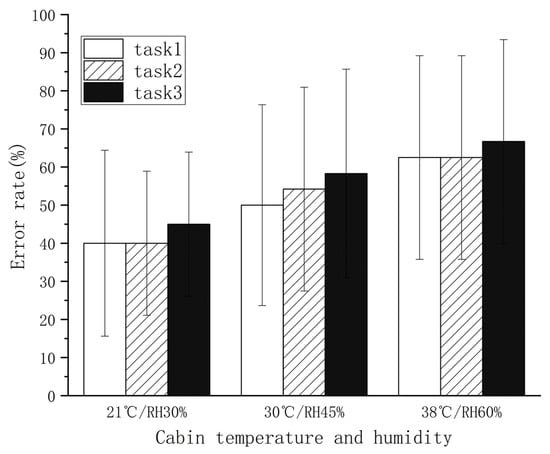 As shown in Figure 9, the target is operation rates of subjects, not differences during the same missions, which presented slight increases over time (p > 0.5). In contrast, with the rise in temperature and humidity, the error rates increased for all three missions (p < 0.01). The mean error rate was up to 63.9% in a 38 °C/60% RH environment, which was lower than 60% in a 30 °C/45% RH environment.