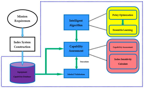 Figure 1. Taking mission requirements as the traction, we build a global index system. We then establish a database based on equipment indexes and equipment capabilities, that is, the Equipment Capability database in the figure, and provide data for capability assessment. Based on neural network, through different network policy optimization methods, the improved neural network algorithms obtained is ensemble learning, and the method is to find solutions to the generalization performance and local minima in neural network learning. On the basis of intelligent algorithm research, with the support of equipment indexes and capability database, an equipment capability assessment model is established, that is, the Capability Assessment in the figure. Through equipment capability estimation and data verification, the model is iteratively verified to solve the accuracy and stability of the model capability assessment. Taking the equipment capability assessment as the research object, the study of general equipment assessment methods provides support for the entire process, from equipment demonstration to operational use, and has significant scientific significance and application value. The focus of this paper is workflow shown in the blue dotted box of the figure.
