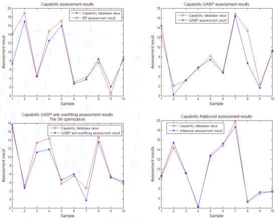 In order to directly reflect the effect of the algorithm on equipment capabilities assessment, the results of BP neural network, GABP optimized neural network, early-stopping algorithm and ELPONN are shown in