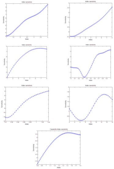 Figure 7 shows the sensitivity of the equipment capability index. It can be seen from the figure that some sensitivities increase with the index values, and some will be saturated. In addition, some indexes are more sensitive to the capability in the middle range.