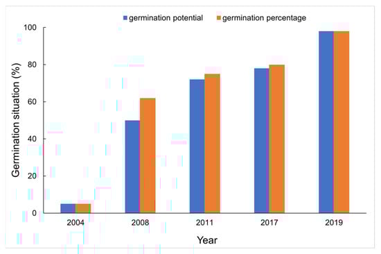 The results of germination test showed that germination percentage of the seeds with four storage years (i.e., harvested in 2004, 2008, 2011 and 2017) was lower than that of the non-aged seeds harvested in 2019, and with the increase of naturally aging years, the germination percentage and germination potential of seeds decreased (Figure 1), especially, compared to the germination percentage of 98% in 2019 in which only 5% was achieved in 2004.