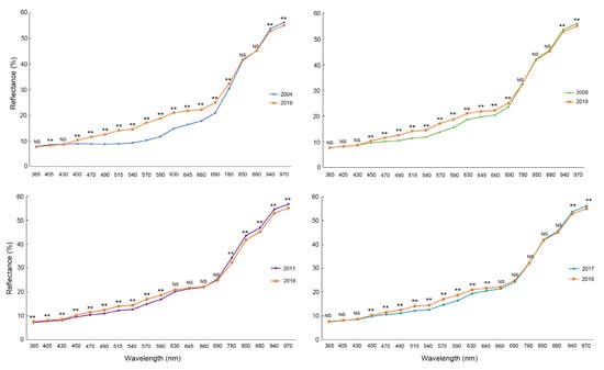 Reflectance of 19 wavelengths in aged seeds vs. non-aged seeds (CK). ** and NS on the lines indicate significant difference and no significant difference, respectively.